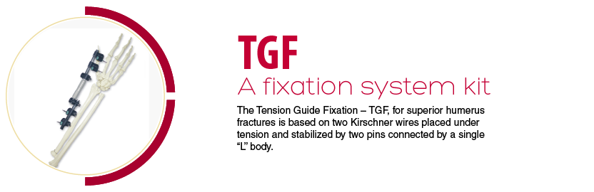 La fijación de la guía de tensión - TGF, para fracturas superiores del húmero se basa en dos alambres de Kirschner puestos bajo tensión y estabilizados por dos pernos conectados por un solo cuerpo "L".
