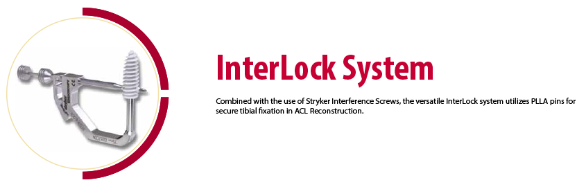 Combinado con el uso de tornillos de interferencia Stryker, el versátil sistema InterLock utiliza clavijas PLLA para fijación tibial segura en la reconstrucción de ACL. • Cross-Pin diseñado para reducir el deslizamiento del injerto y promover una rehabilitación agresiva.